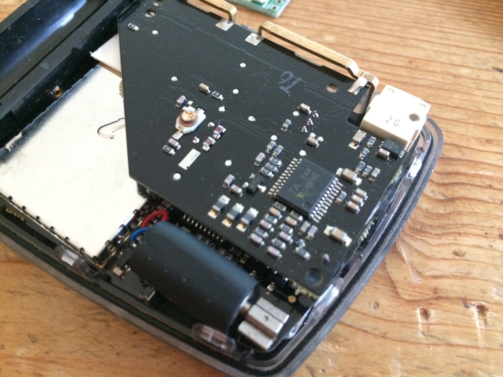The board also has some convenient labels on the copper layer; RFE and RSSI were clearly marked. As a battery-saving measure, the radio board requires the application processor to provide a signal, enabling the receiver. As we want to receive all parts of all frames, we can't have the existing application processor switching off the receiver mid-frame. Fortunately, VCC used by the pull-up resistors is pretty closeby. Pulling the RFE pad high enables the receiver on a contiuous basis.