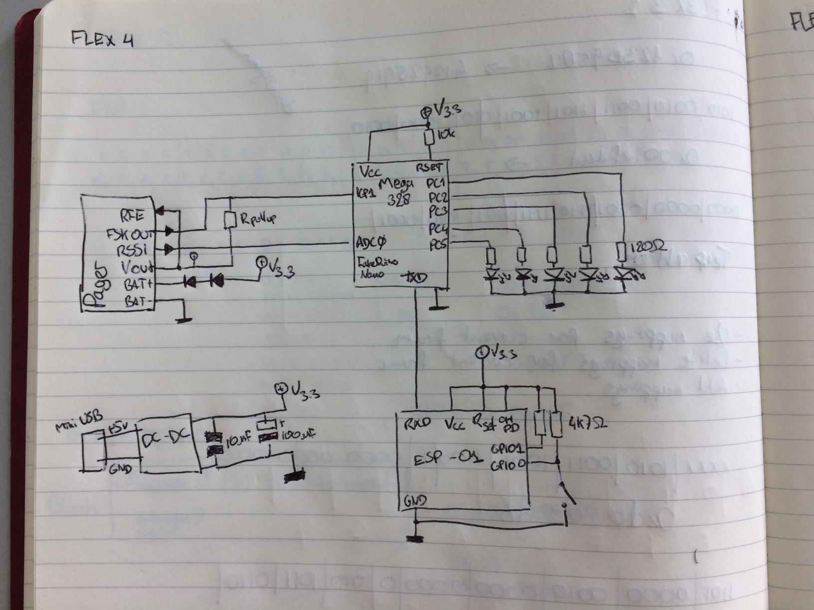 The pager wanted 1.5v, but I only had space for one DC-DC converter in the little ABS case. As the power consumption for the pager was greatly reduced by getting rid of everything but the bare essentials, I was able to drop the 3.3v I needed for the ESP8266 and the ATMega328 down to about 1.9v by adding two diodes in series. I also wired a bunch of leds to the Arduino board. I had a lot of spare IO anyway, and you can never have too many pretty lights.